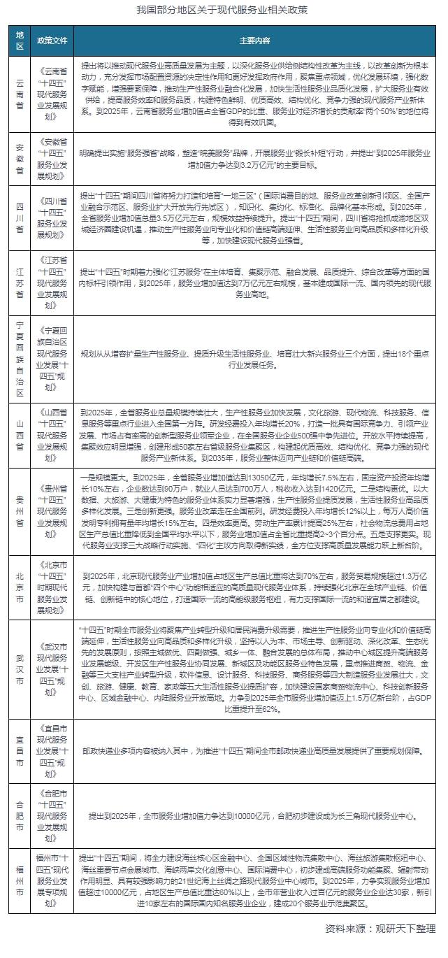 地方層面上,例如云南省發布的《云南省“十四五”現代服務業發展規劃》,提出將以推動現代服務業高質量發展為主題,以深化服務業供給側結構性改革為主線,以改革創新為根本動力,充分發揮市場配置資源的決定性作用和更好發揮政府作用,聚焦重點領域,優化發展環境,強化數字賦能,增強要素保障,推動生產性服務業融合化發展,加快生活性服務業品質化發展,擴大服務業有效供給,提高服務效率和服務品質,構建特色鮮明、優質高效、結構優化、競爭力強的現代服務產業新體系。到2025年,云南省服務業增加值占全省GDP的比重、服務業對經濟增長的貢獻率“兩個50%”的地位將得到有效鞏固。